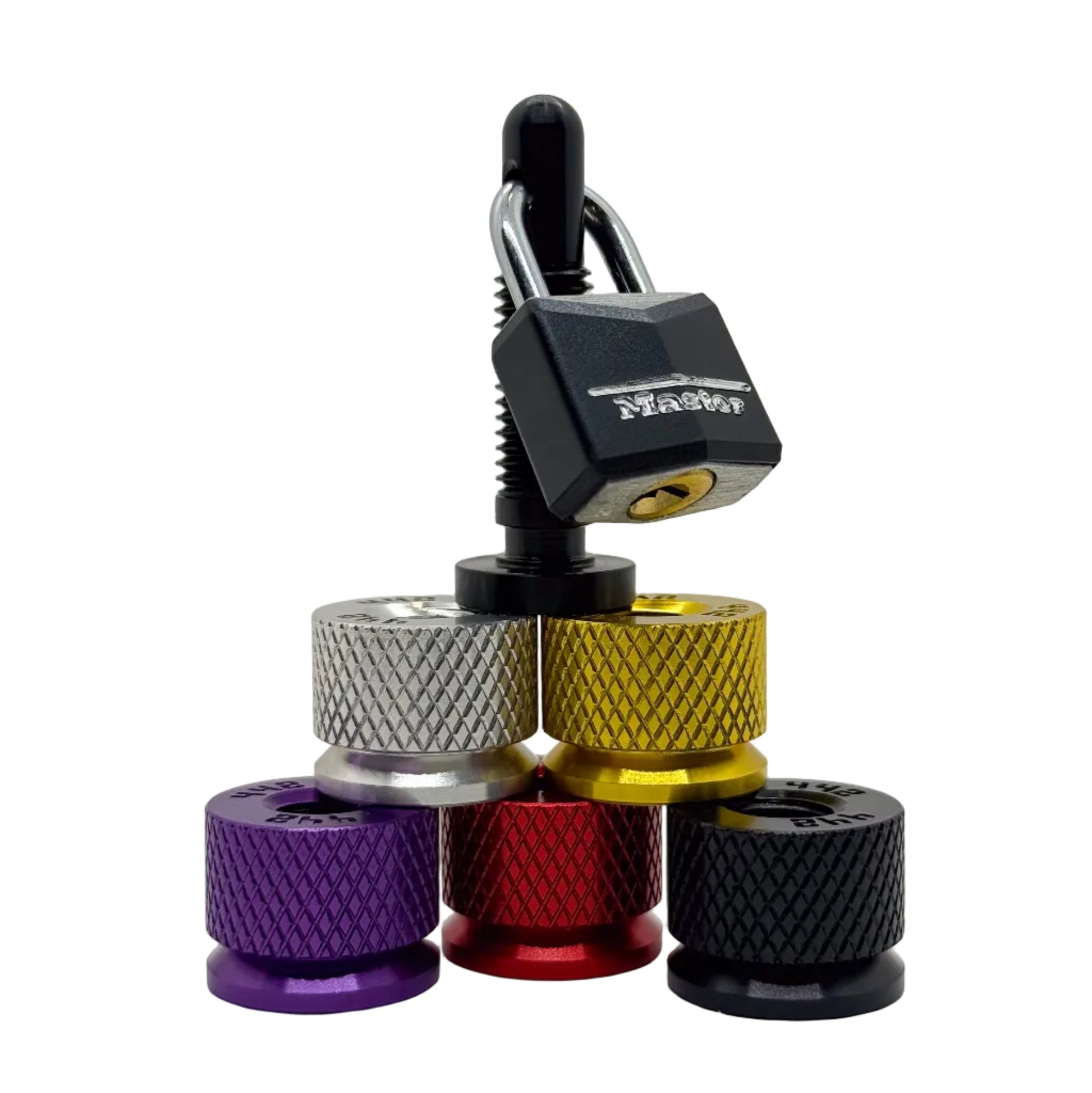 L'antivol de selle 442 parts disponible en 5 couleurs, rouge, or, noir, alu et violet.