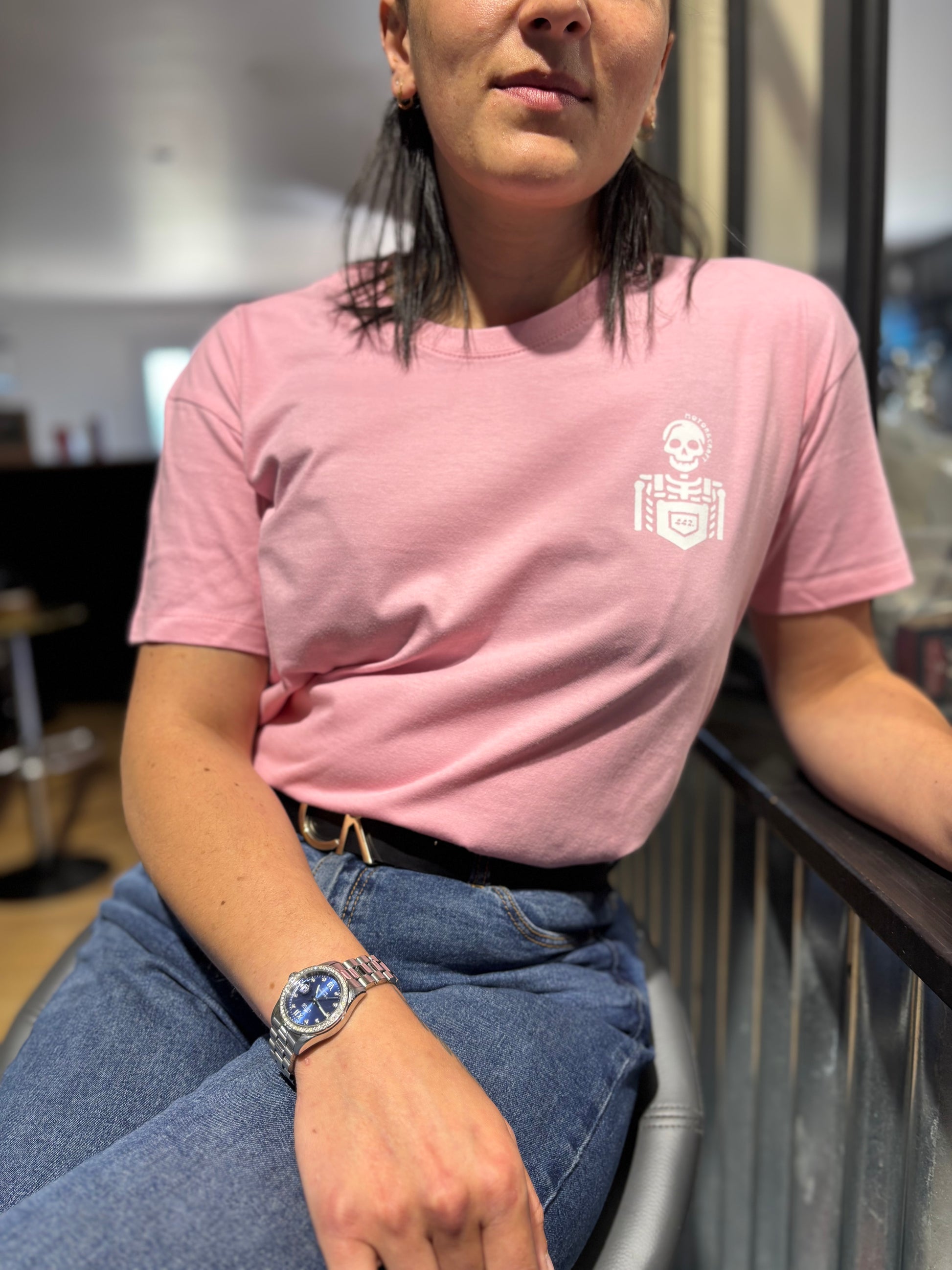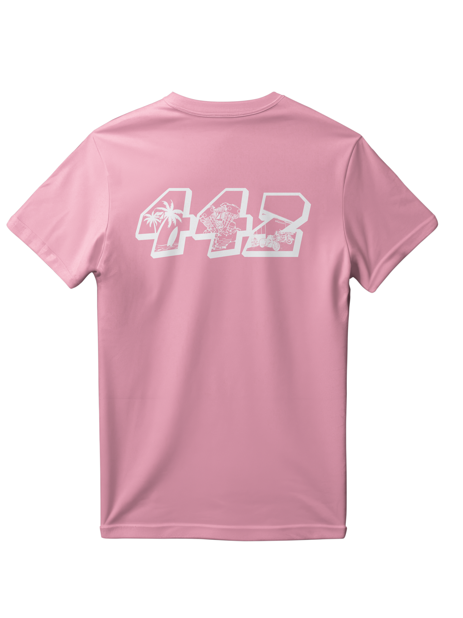 Le t-shirt 442 rose avec le squelette sur le cœur et le design 442 au dos.